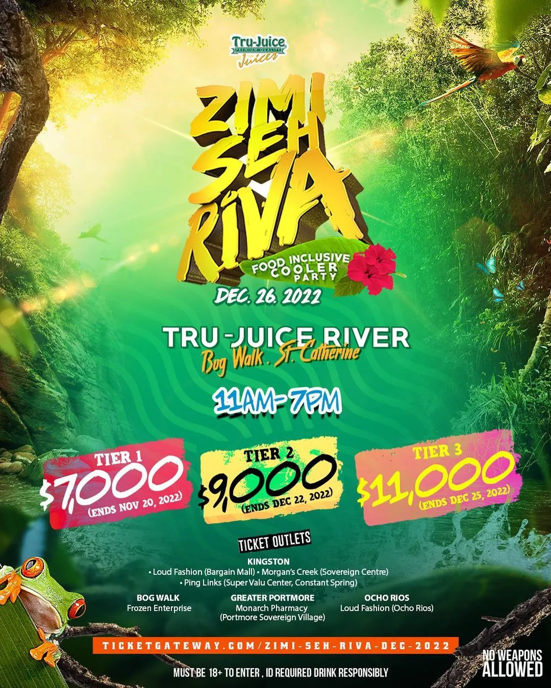 Zimi Seh Riva - Monday December 26, 2022 🌊 - Tru Juice River, Bog Walk, St. Catherine 📍Food Inclusive Cooler Party 📍Zimi Seh Riva Mugs 📍Sno Cone Inclusive 📍Coconut Inclusive 📍Polaroid Inclusive Tier 1 Tickets Go On Sale November 1st, 2022 Tickets are now available at the following outlets: 🥥 Morgans Creek (Sovereign Centre) -